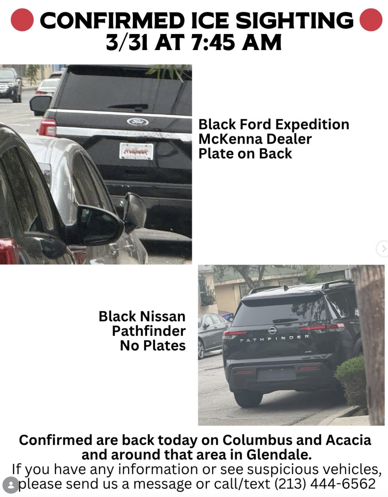 sighting. suspected ice. two unmarked vehicles, one is a decommissioned law enforcement vehicle. two officers. white mal ..
